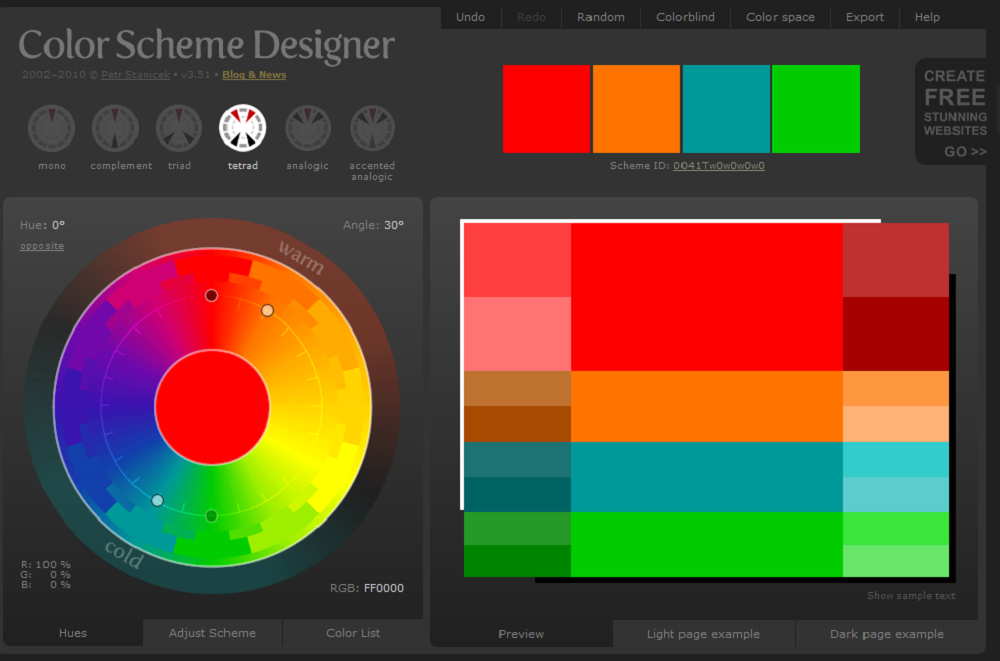 Khác với 2 website trên là lấy màu, Colour Scheme designer cho phép người dùng tạo ra bảng phối màu trực tuyến bằng cách điều chỉnh độ sáng, độ bão hòa, độ tương phản,... Ngoài ra bạn hoàn toàn có thể nhập màu gốc từ vòng tròn phân phối và thế là những màu còn lại sẽ tự động hình thành dựa trên màu chủ đạo này theo các phương pháp kết hợp cơ bản.